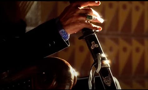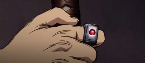 For starters, he has a distinctive design that draws attention to itself. Unlike the other Yakuza, he is rather tall, wears a nearly all-white suit and is clearly the most capable and intimidating fighter. Not only is he the one who actually kills O-Ren’s father, but the film draws attention to this character by using an elaborate pan-up shot that tracks the Katana sword, showing us Riki’s rings. We even get a shot of O-Ren staring at Riki with hate in her eyes. And then, at the end, Riki even gets a cool mike drop move, where he kicks a burning cigarette butt that sets fire to the room.