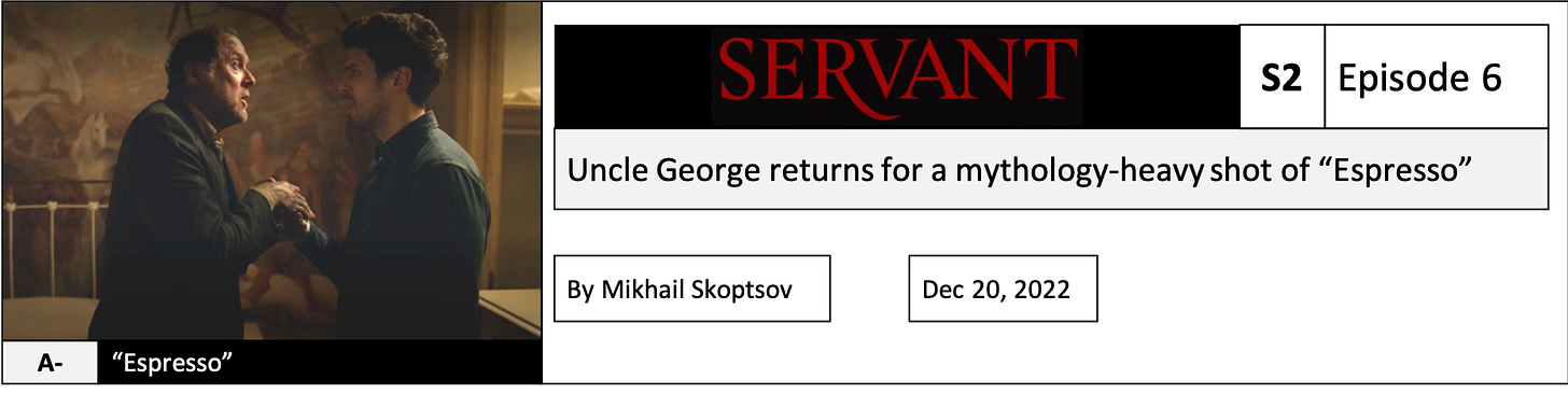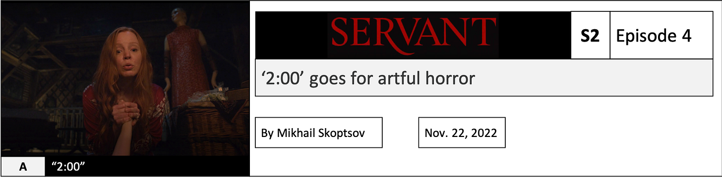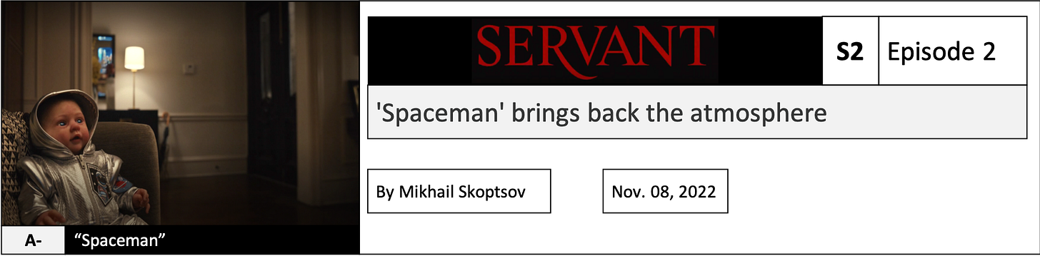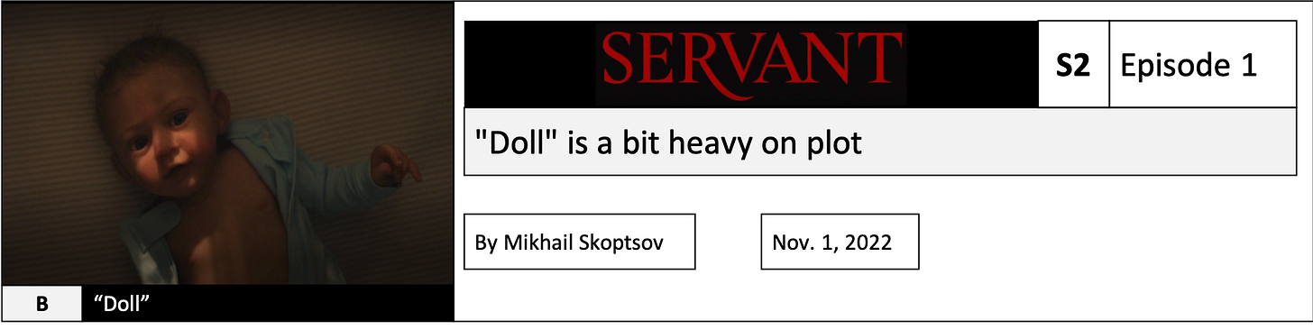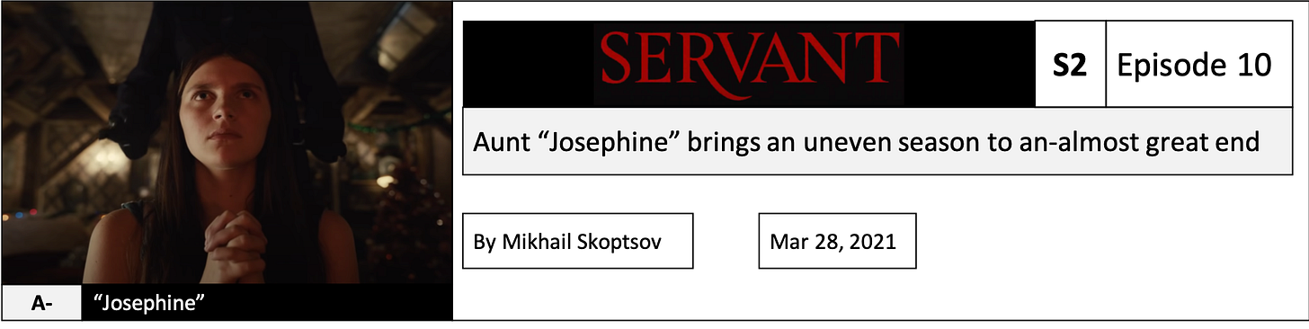 This is a custom navigation page for my reviews of the Apple TV+ Original television series Servant (2019-2023). It was created in response to Substack changing its interface in a way that undermined my use of graded images for episodic reviews.